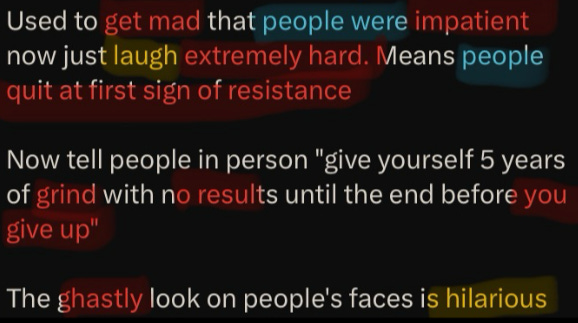 Honestly, the master persuader put so little effort into showing the essence of the piece of wisdom here that I’m giving him too much credit. There’s not a single explicit statement indicating that there are any rewards at the end of the tunnel in this post.